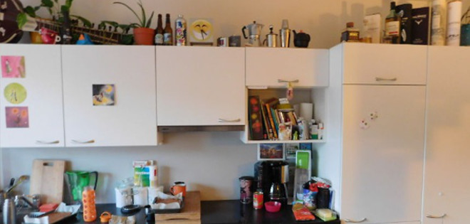 A simple vista, sólo se trata de una cocina desordenada. Pero si estás decidido o decidida a localizar al gato, la pista es que no está sobre los muebles de la cocina sino en el ángulo superior derecho de la imagen.