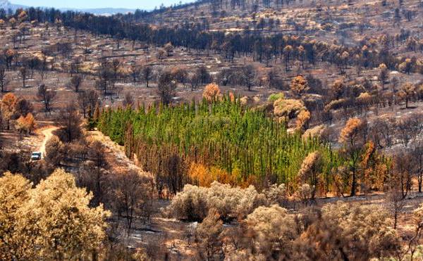 Más de 20.000 hectáreas de bosque calcinadas. Y en el medio de la devastación, un grupo de cipreses verdes y erguidos.