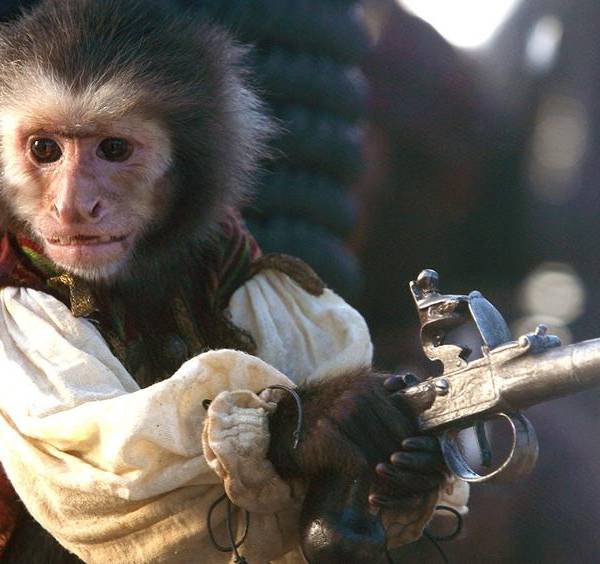 En todas las entregas de la saga, aparece un capuchino, perteneciente al pirata Barbosa, que suele protagonizar alguna escena cómica. Sin embargo, la organización PETA -Personas por el Trato Ético de los Animales- denunció un caso de maltrato a pesar de que en los créditos aparecía la marca registrada de American Humane: No Animals Were Harmed.
