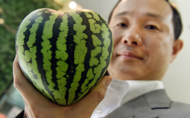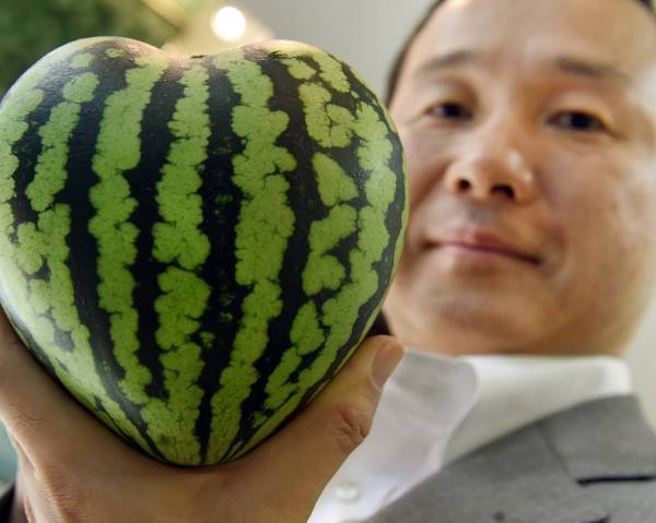 En Japón, las sandías en forma de cubo o corazón sirven de adorno
