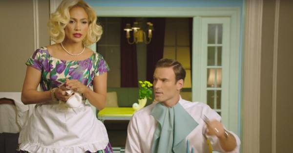 JLo se convierte en una ama de casa en los años 50 vestida por Jame Galanos y Sophia Webster, una secretaria en los años 60 con un atuendo de Mark Zunino y zapatos de Louis Vuitton y en una obrera de la década de los 70 con una camisa de Current Elliott y un pantalón de Paige.