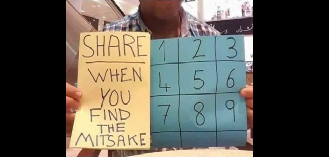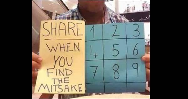 El hombre publicó en su perfil su foto con dos carteles. Uno dice "Compártelo al encontrar un error", y en la otra puso los números de 1 a 9. Se reveló, que el error se escondía entre las letras, no las cifras. En vez de poner 'error' en inglés como 'mistake', escribió 'mitsake'.