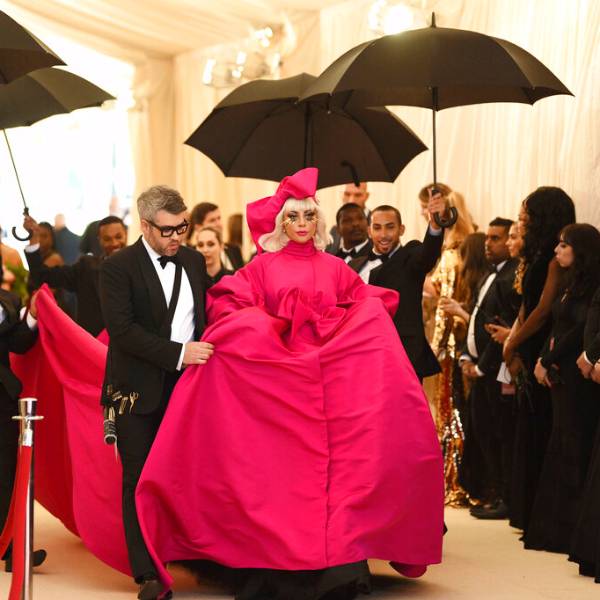 Brandon Maxwell, quien creó el modelo, ayudó a Gaga a subir por las escaleras del Museo Metropolitano de Arte mientras posaba rodeada por varios asistentes que llevaban grandes sombrillas. Maxwell le retiró el vestido revelando otro vestido negro asimétrico con una enorme cauda lateral. Gaga se quitó el segundo vestido para revelar otro rosado que recordaba a Marilyn Monroe en "Los caballeros las prefieren rubias”, con el cual caminó nuevamente por la alfombra rosa.