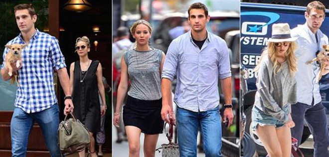 La actriz Jennifer Lawrence, muy bien protegida por Justin Riblet