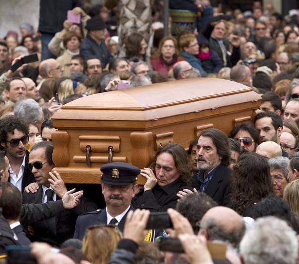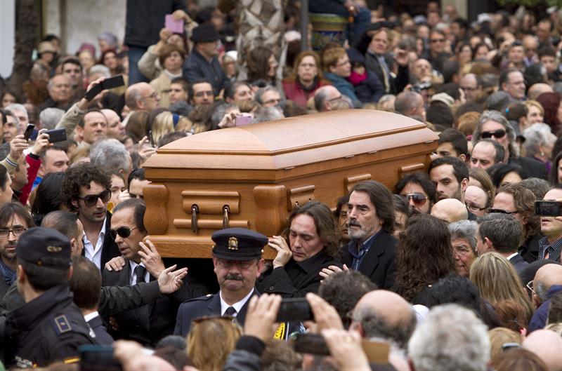 En una jornada de tenue lluvia, como un llanto que se ha ido intensificando a lo largo de la mañana, el féretro salió del Ayuntamiento portado por familiares y compañeros como Vicente Amigo, Tomatito y Raimundo Amador, algunos de los cuales velaron toda la noche el cuerpo.