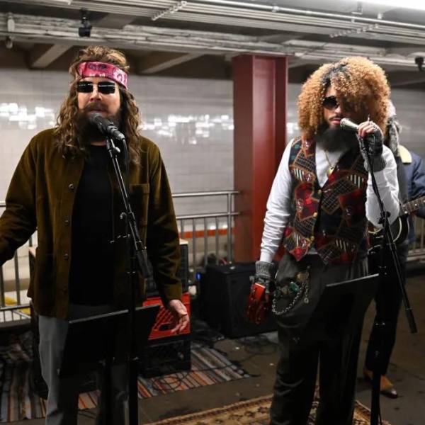 Ambos, disfrazados con largas pelucas rizadas y barbas falsas al estilo de los años 60, ofrecieron un espectáculo único que dejó a los presentes asombrados.