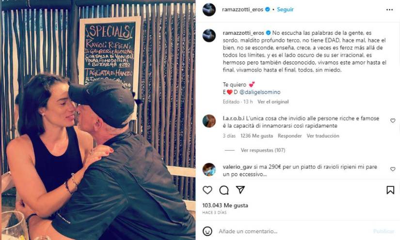 Mediante su cuenta de Instagram, el intérprete publicó una imagen junto a su joven conquista de 34 años, post que acompañó con una sentidas palabras de amor: "No escuches las palabras de la gente. El amor es sordo, terco, no tiene edad, hace bien, no se esconde, enseña, crece, a veces es feroz y a veces sobrepasa los límites".