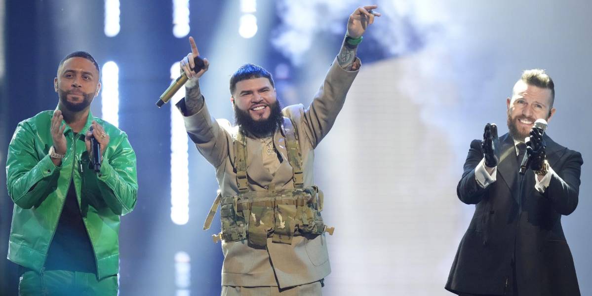 Farruko, en el centro, junto a DJ Adoni, a la izquierda, y Daniel Habif, durante su actuación en la ceremonia de los Premios Lo Nuestro, en Miami.( )