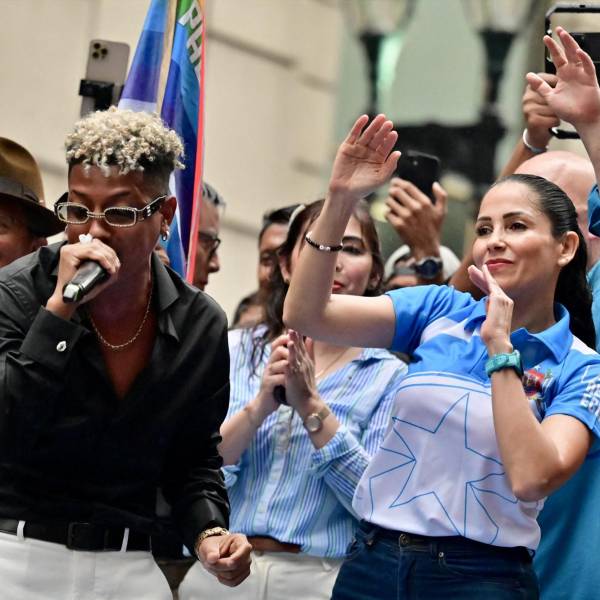 El cantante ecuatoriano Jombriel actúa junto a la candidata presidencial de Ecuador por el partido Movimiento Revolución Ciudadana, Luisa González, mientras baila durante su mitin final de campaña en Guayaquil, Ecuador, el 10 de abril de 2025.( )