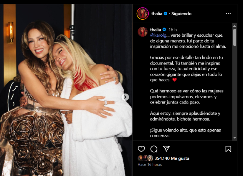 A pesar de la diferencia generacional —Thalía, ícono de la música pop y telenovelas en los noventa; Karol G, actual referente del reguetón global—, el respeto y la admiración mutua marcan un momento simbólico de sororidad y continuidad en la música latina.