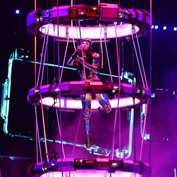 La intérprete era elevada en una estructura retrofuturista como si fuese un robot. Justo antes de ascender por el entramado de cables, la artista recibió la descarga eléctrica que la inmovilizó por unos segundos. El momento quedó registrado en video y se ha difundido en redes sociales.