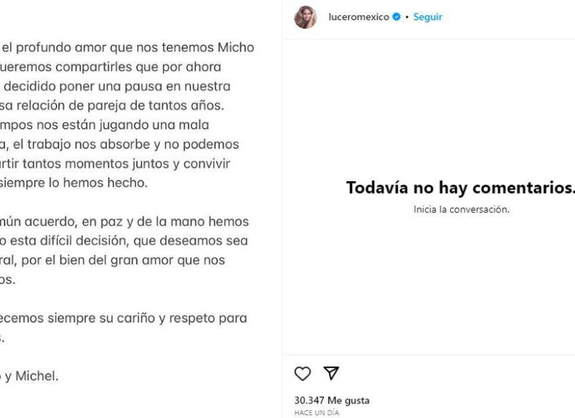 "Desde el profundo amor que nos tenemos Micho y yo, queremos compartirles que por ahora hemos decidido poner una pausa en nuestra hermosa relación de pareja de tantos años. Los tiempos nos están jugando una mala pasada, el trabajo nos absorbe"
