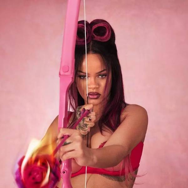 A través de su cuenta de Instagram, Rihanna compartió un video corto y una serie de fotografías en las que se la ve luciendo lencería roja de encaje, mientras asume el rol de Cupido al lanzar una flecha y posar con un arco, acompañado de un chal hecho de rosas.