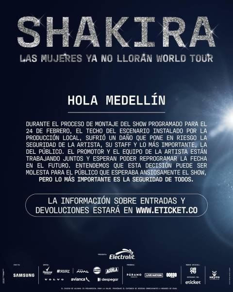 La cantante Shakira continúa con su gira Las Mujeres Ya No Lloran World Tour, aunque no sin algunos contratiempos. Tras varios rumores sobre la cancelación de su concierto en Medellín, la productora responsable confirmó la noticia.