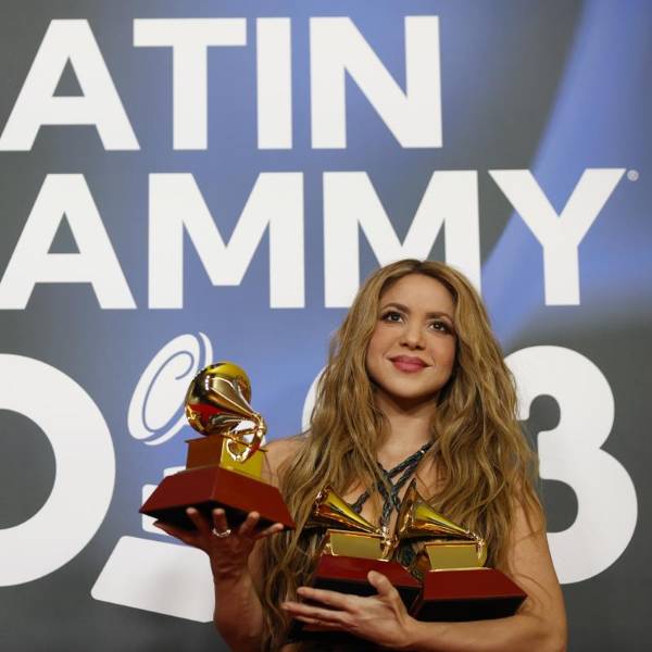 La cantante colombiana Shakira posa con los tres premios conseguidos durante la gala anual de los Latin Grammy celebrada este 16 de noviembre.( )