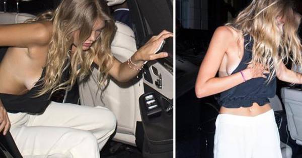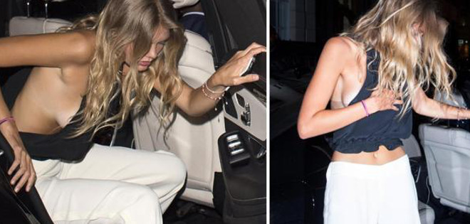 Para evitar mostrar demás, Bronte trató de tapar su delantera con la mano. De todos modos, los fotógrafos lograron capturar los pechos de la novia de Justin casi totalmente al descubierto.