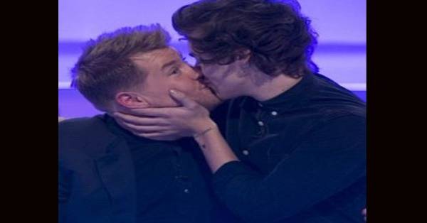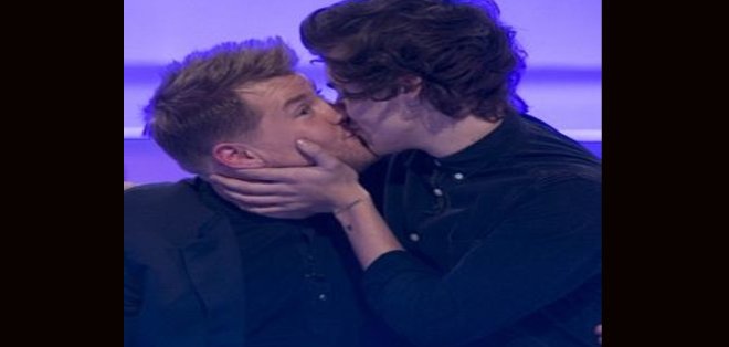 El beso se produjo cuando Harry y sus compañeros de banda 1D, Niall Horan y Louis Tomlinson aparecieron en el exitoso programa británico de televisión A League of Their Own, donde James es el conductor.