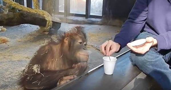 Jingga es una joven orangután hembra que acostumbra sentarse junto al vidrio de su jaula para interactuar con los visitantes del Zoológico de Barcelona. Hace una semana, un visitante comenzó a jugar con ella y le hizo un “truco de magia” al desaparecer un fruto que le había enseñado. La primate mira el vaso vacío y se lanza al piso muerta de la risa. El video fue subido a la red el 7 de diciembre y tiene 8,8 millones de visitas.