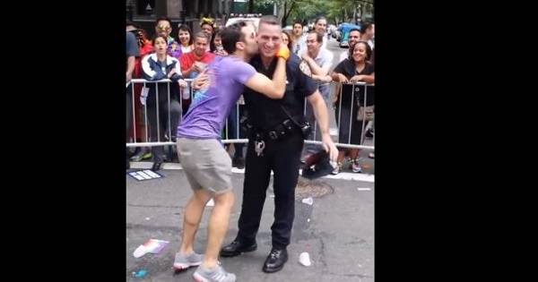Un agente del Departamento de Policía de Nueva York bailó junto a un asistente a la marcha. Un baile provocativo, divertido y pegajoso es el que protagoniza este agente de la ciudad, y que está dando mucho que hablar. Como agradecimiento por este gesto, el joven que bailó con el policía le dio un beso cuando terminaron su actuación.