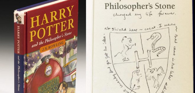 Una primera edición del libro "Harry Potter y la piedra filosofal" con anotaciones a mano e ilustraciones realizadas por la autora británica J.K. Rowling fue subastada hoy en Londres por 150.000 libras (228.083 dólares)