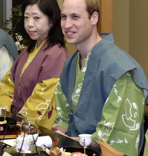De viaje sin su esposa Kate, que pronto dará a luz a su segundo hijo, William, segundo en la línea de sucesión al trono británico, pidió un sable para perfeccionar su atuendo de la nobleza guerrera del Japón feudal antes de las fotos.