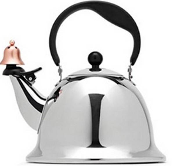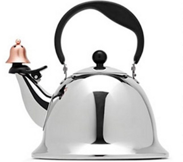 Muestra a la tetera diseñada por Michael Graves, con una campanita anaranjada que promete sonar cuando el agua esté lo suficientemente caliente.