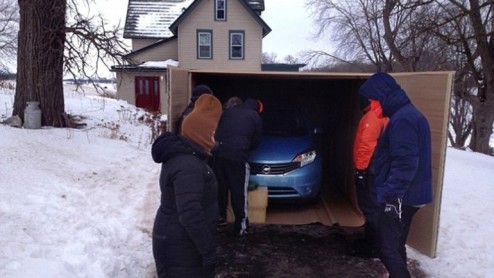 Una enorme caja llegó a Wisconsin con la versión 2014 del automóvil Nissan Versa Note.