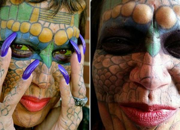 El transexual, de 55 años, también tiene cuernos implantados en la frente, todo su cuerpo completo de tauajes y escarificaciones en la cara y en el pecho que se asemejan a las escamas de los reptiles.