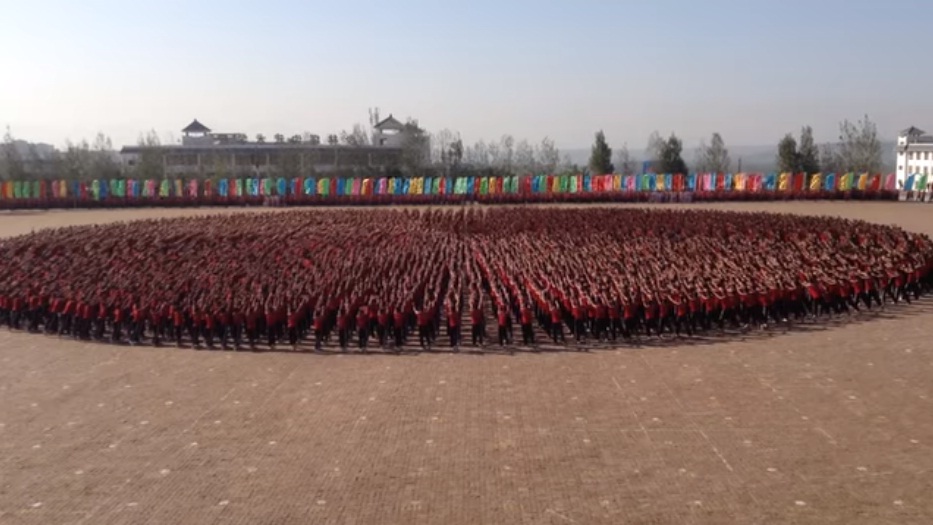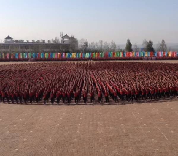 Una multitudinaria coreografía tiene atónitos a los usuarios, viene de la mano de los aprendices de la reconocida "Tagou" china, una de las escuelas de artes marciales más populares del mundo, que se ganó tal reconocimiento a partir de los ejercicios de coordinación.