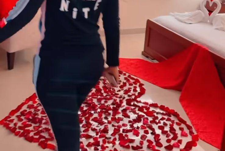 La suite del hotel que comparten los recibió con un piso adornado de rosas rojas en forma de corazón, y una grande cama donde también se divisaron algunos adornos que recibieron a la joven pareja, misma que permanecerá unida en la gira de Peralta.