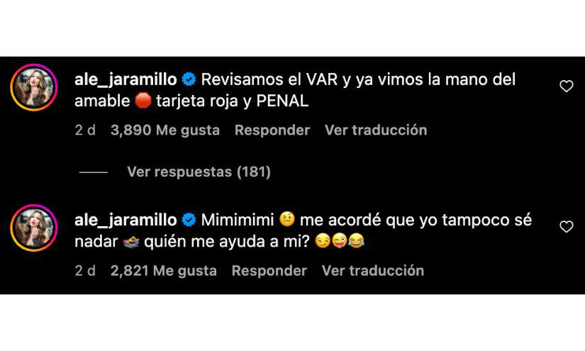 Aunque los comentarios de Alejandra reflejan un tono jocoso con el que ya es conocida en sus redes, la opinión de los usuarios se dividió entre los que de igual forma tomaron con humor el momento y los que no estuvieron de acuerdo con que el colombiano ayude a la dama en traje de baño.