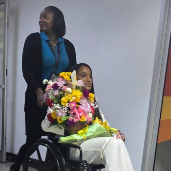 Tras casi un mes de incertidumbre y cuidados intensivos en Tailandia, la reina de belleza regresó a su natal Jamaica en silla de ruedas y acompañada por sus familiares.