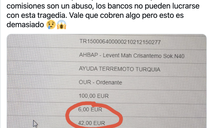 La internauta adjuntó una muestra, donde se constató un recargo total de 48 euros (aproximadamente 51 dólares) y afirmó que "los bancos no pueden lucrarse con esta tragegia", agregando que es aceptable que se cobre un valor extra, pero no esa cantidad tan elevada en este momento de angustia para dos naciones.