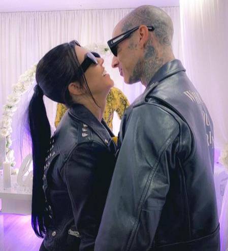 La empresaria de 44 años aparece en imágenes con un top transparente en la que se ve su pancita de pocos meses de embarazo, con un pantalón de cuero a las caderas, mientras que Travis está en su papel de baterista, con las baquetas encima de la panza de la futura madre.