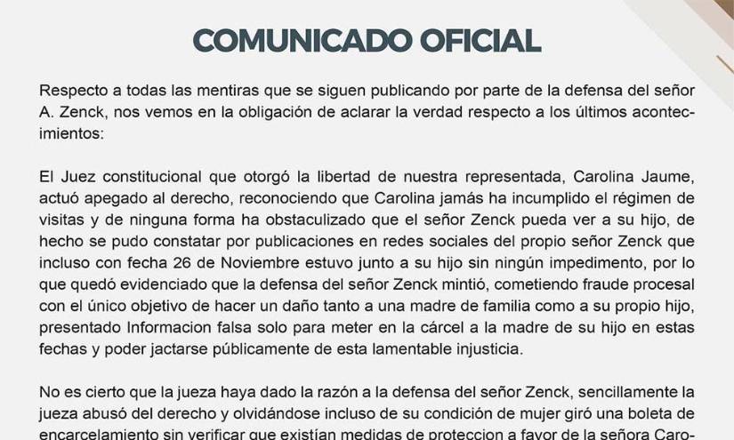 Dichas declaraciones llevaron a que los abogados de Jaume publiquen un comunicado al respecto, recalcando que su representada no ha incumplido el régimen de visitas e incluso, en las redes sociales de Zenck se evidencian fotos publicadas con su hijo hace algunas semanas.