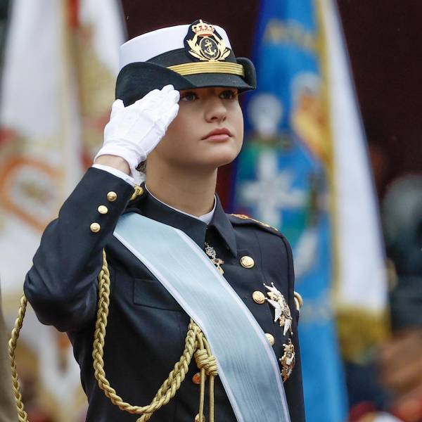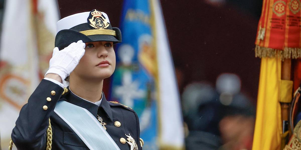 La princesa Leonor en este evento lució el uniforme de gala de la Armada, su segunda vez como militar, en el desfile del 12 de octubre. Lo hizo como guardiamarina de primero de la Escuela Naval de Marín (Pontevedra) de La Armada, donde ingresó el pasado 29 de agosto.