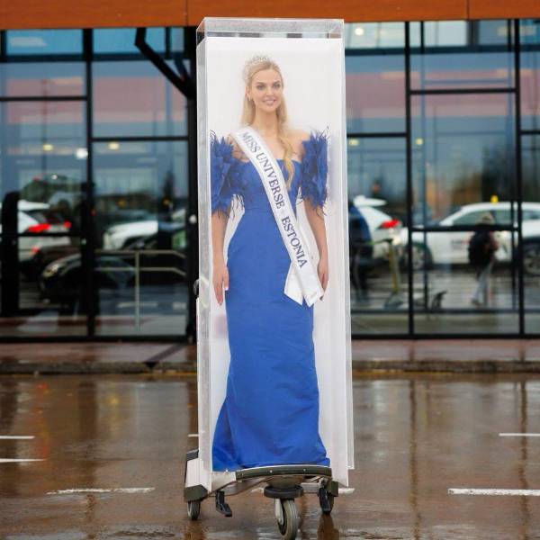 La representante de Estonia en Miss Universo, Brigitta Schaback, revolucionó las redes sociales y el mundo de los concursos de belleza con su partida hacia Tailandia, sede del Miss Universo. La reina estonia se subió a su vuelo dentro de una caja de simulación de cristal, replicando de forma perfecta la icónica presentación de una muñeca Barbie humana.