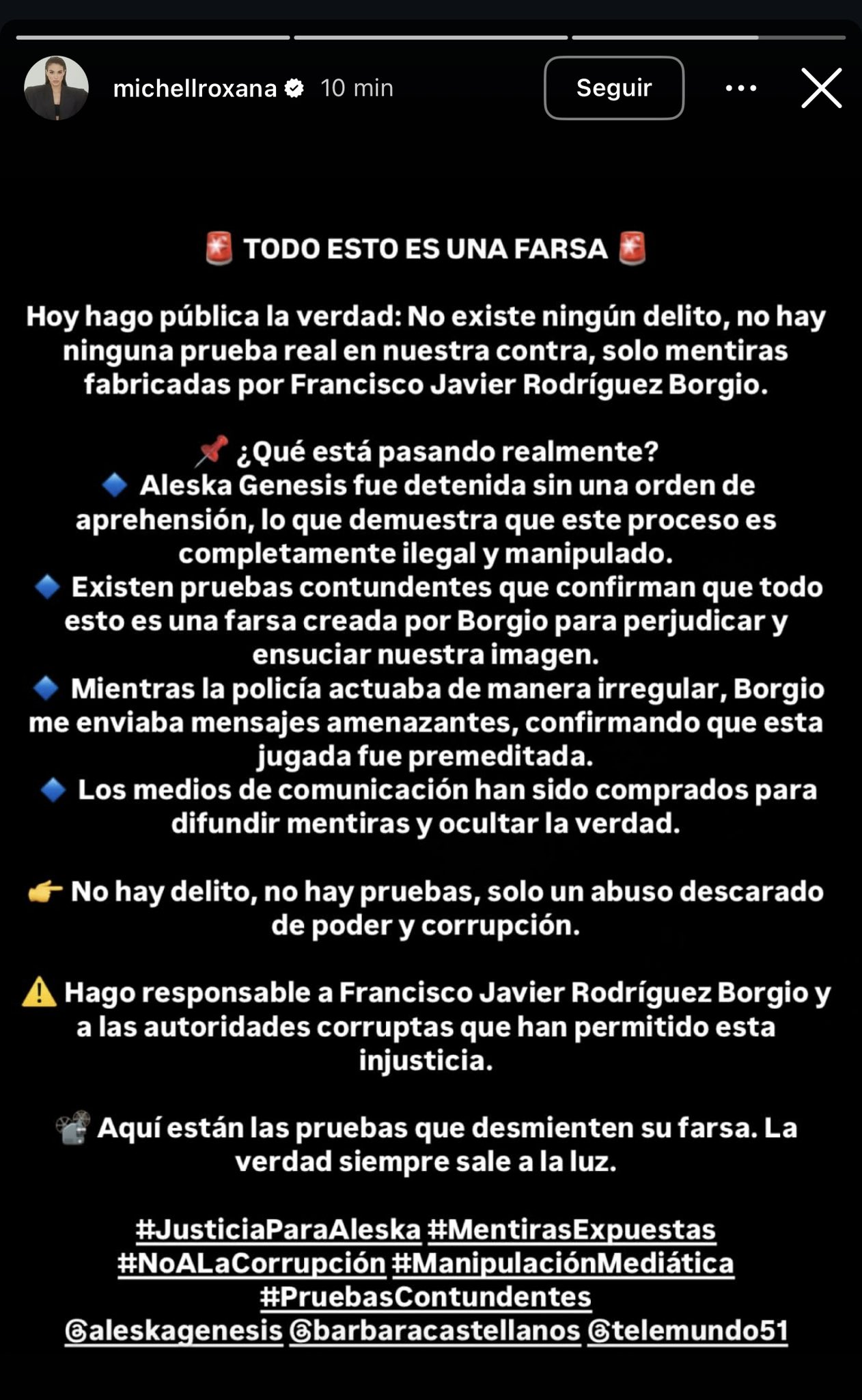 “Culpo directamente a Francisco Javier Rodríguez Borgio, autor de todos los casos falsos quien me ha estado enviando mensajes de amenazas justo en el momento en que la policía llegó a detener ilegalmente a Aleska Genesis Castellanos en la Ciudad de México”, escribió Michell Roxana, hermana de la modelo, en redes sociales, quien afirmó que su familiar fue detenida sin una orden judicial.