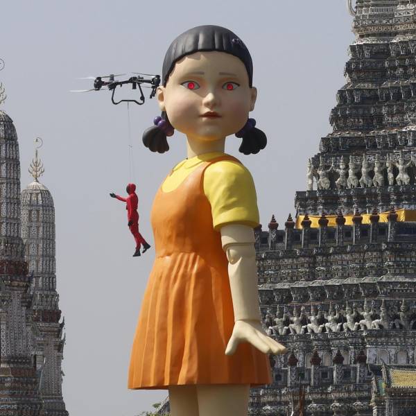 El evento, organizado para celebrar el próximo estreno de la segunda temporada el 26 de diciembre, fusionó elementos de la cultura tailandesa con el simbolismo de la serie. La gigantesca muñeca, conocida por ser un elemento central de los macabros juegos en la trama, parecía observar a la multitud, generando una atmósfera de intriga y expectación.
