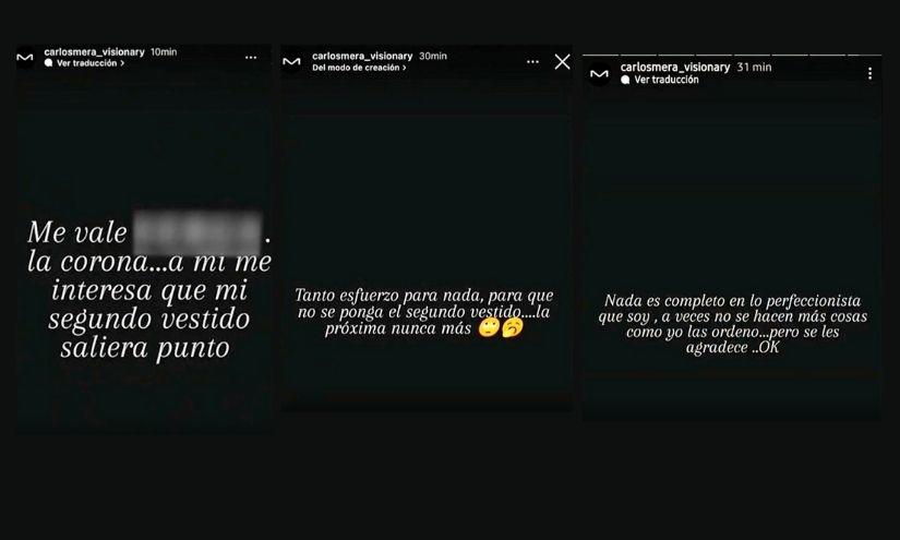El diseñador expresó su malestar en historias de su cuenta de Instagram, en las que afirmaba sentir que el esfuerzo que puso en la prenda que no lució habría sino en vano y que en el certamen no se habrían hecho las cosas como él ordenó.