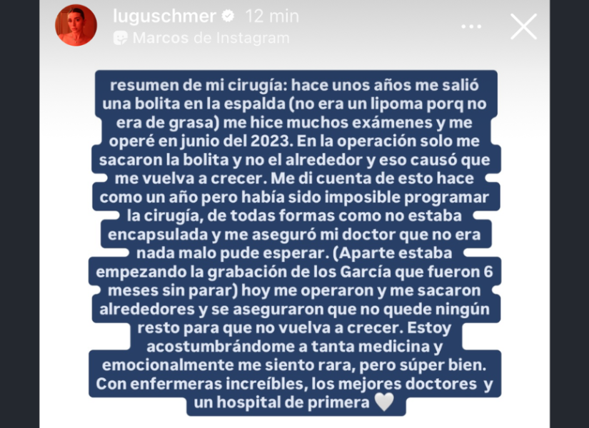 Luciana reveló que la intervención fue para extraer un lipoma —una masa benigna de grasa— ubicado en la parte baja de su espalda. Ya había sido operada por el mismo problema en 2023, pero el procedimiento anterior resultó incompleto: “No limpiaron bien el área y volvió a salir”, explicó.
