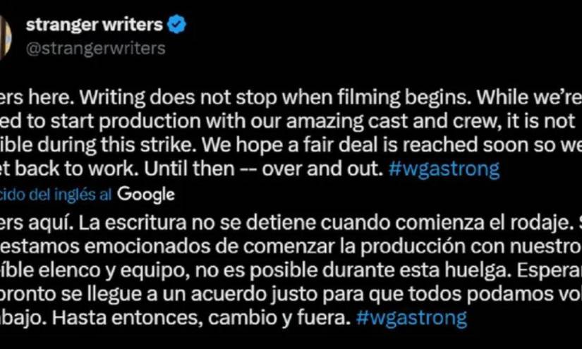 Los creadores de Stranger Things, reconocida serie de Netflix, revelaron que no es posible comenzar la producción de la última temporada debido a la existencia de una huelga de guionistas.