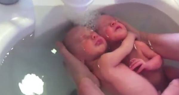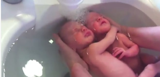 El tierno video de bebés gemelos se abrazan durante el baño.