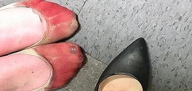 Aquellos que trabajen en atención al cliente saben lo que es pasarse horas y horas de pie. Pues bien, una imagen está arrasando en Facebook demostrando cómo sangraron los pies de una camarera a la que su jefe obliga a llevar tacones altos a pesar de sus heridas. La foto ya se ha vuelto viral en esta red social.