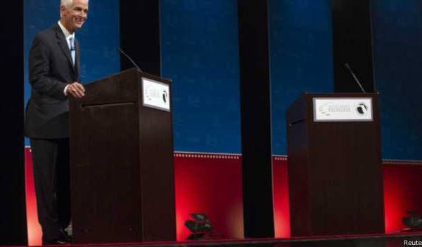 El aparato es frecuentemente usado por el demócrata Charlie Crist durante sus actos públicos y este miércoles lo tenía a sus pies oculto tras un atril durante el debate televisado frente al republicano Rick Scott, actual gobernador compitiendo para la reelección.