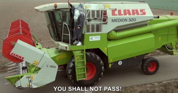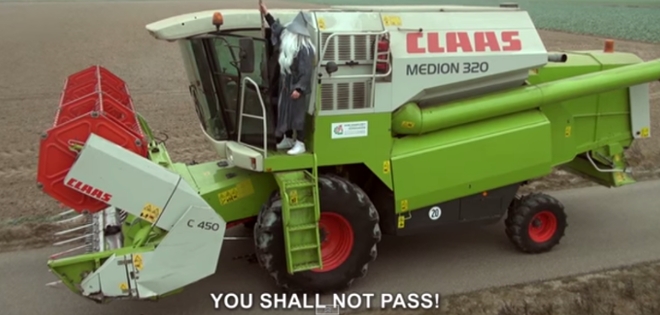 Primero aparece el personaje de Gandalf montado en un tractor y, recreando una de las escenas del filme, le grita al carro que no pasará. Luego hace un gesto y aparece el resto de los personajes subidos en otro tractor.