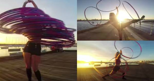 Podría tratarse de la mejor bailarina del mundo en el arte del “hula-hula” pues ella se mueve con 30 aros girando simultaneamente por todo su cuerpo.