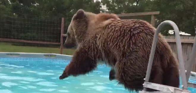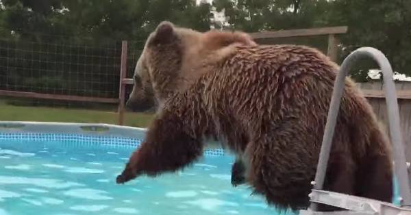 Se trata de un oso pardo que, como cualquier humano lo haría para evitar el calor, no perdió la oportunidad de lanzarse a la piscina de una manera muy particular.