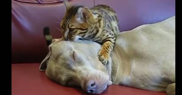 El video publicado por The Huffington Post muestra a los eternos rivales del reino animal, juntos y encariñados mientras el felino, efectivamente, masajea.