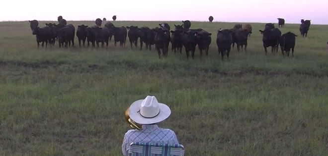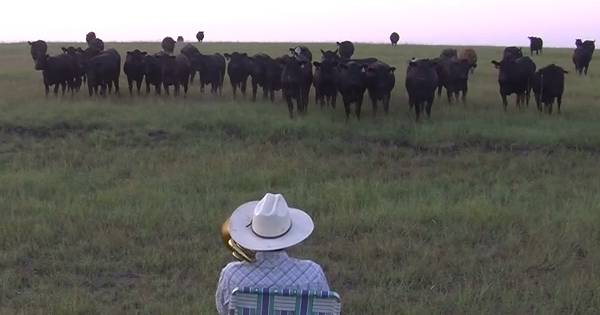 Poco a poco, se observa cómo se asoman las vacas en el horizonte y comienzan a acercarse al vaquero. En pocos minutos se ve rodeado de todas ellas.